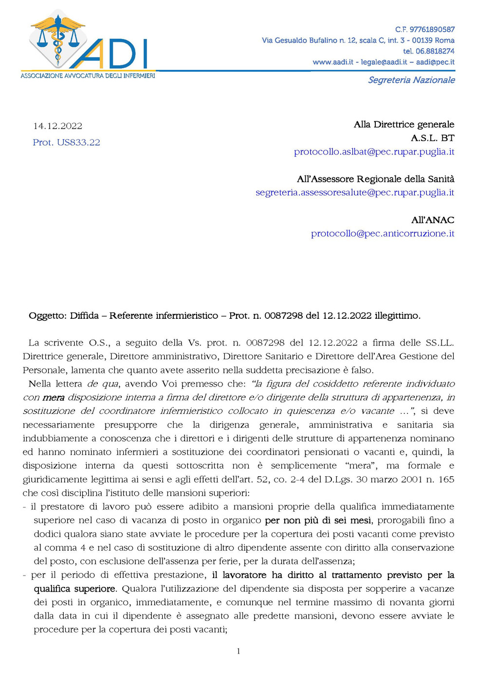 Dura diffida a nome dell'AADI indirizzata alla direttrice generale della ASL BT nonché all'assessore della sanità pugliese e all'ANAC su una letteraccia scritta da tutti i direttori apicali della ASL BT nella quale, facendosi riferimento ai coordinatori facenti funzioni (f.f.) si specifica che non verranno pagati per le mansioni superiori perchè si disconosce l'atto di nomina che gli stessi direttori avevano firmato e che, addirittura, dovranno entrare nei turni anche notturni e festivi come infermieri.